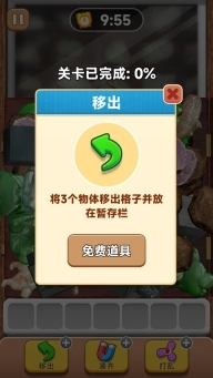 4、玩家可使用道具进行帮助,如“移出”道具,可将3个物体移出格子并放在暂存栏;