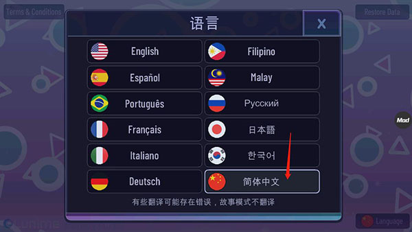 1、在下载安装游戏,游戏初始语言为英文,点击右下角进入语言选项可以更改设置;