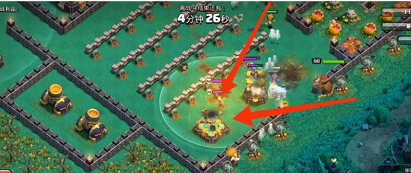 4、女王会在拆掉建筑工人小屋后去拆俩炸弹塔和x弩,此时上方的俩女武神还不在这三个建筑攻击范围之内,所以可以极好的保持良好血量。