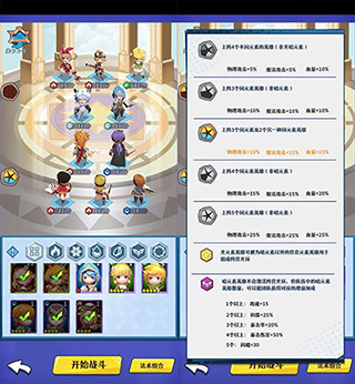 我方派出5名英雄参战,上阵角色的元素属性会带来增益加成,同一元素阵营的英雄数量越多,属性加成便越强。另外,光和暗这两种元素比较特殊,光元素可当作除暗元素外的任意元素阵营,来填充增益光环;而暗元素阵营拥有相对独立的属性加成。