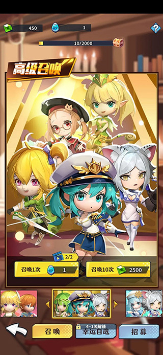 当成功通关1 - 10关卡后,酒馆就会解锁。于酒馆内,选择相应的召唤池,便能招募到慕名而来的英雄们。值得一提的是,首次进行单抽,必定能获得一名SSR英雄!而当团长大人顺利通关3 - 20关卡后,还会额外获得一张幸运自选券。不仅如此,这里还有一项超棒的福利,可任意进行30次十连抽,直至抽到您满意的阵容为止。整个召唤池主要分为“高级召唤”“种族召唤”“友情召唤”这三种类型。