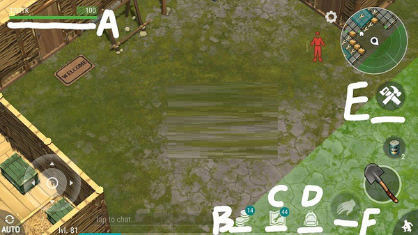 F:功能键,靠近目标物体时比平时亮即可点击使用(左下角为自动。右下角为潜行,潜行后在目标身后或左侧攻击可打出三倍伤害,面对鹿时必须潜行才可击杀)