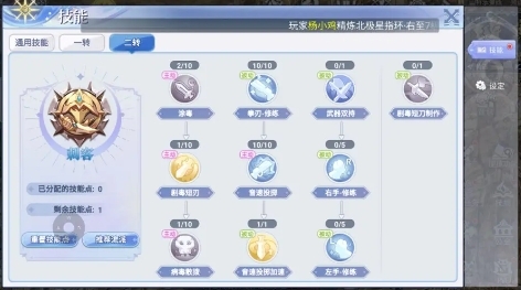 残影+10丨隐匿+1丨施毒+10丨毒刃+10丨解毒+1丨偷窃+7