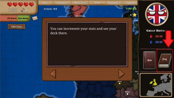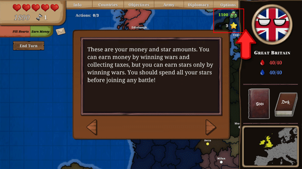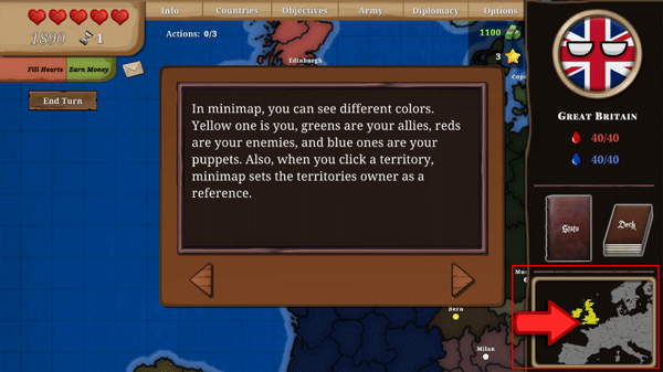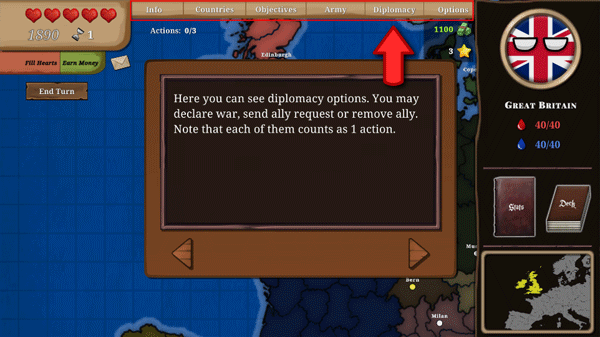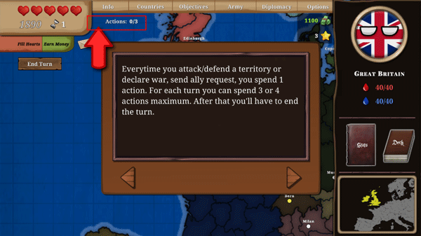 9、每当你进攻或防御一个领土,亦或是宣战,都需发送盟友请求,此操作耗费1个行动。每个回合内,你最多可花费3至4个动作,之后便必须结束该回合。当你结束回合时,你的行动将被重置,同时其他国家会执行他们的行动。此外,每经过2个回合,你能填满1颗心。