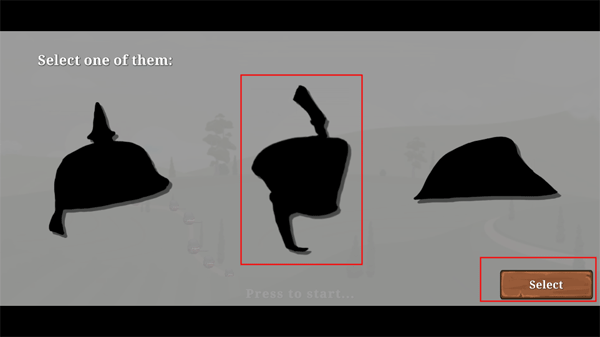 1、进入游戏 ,你会看到有三种帽子,一种帽子代表一个国家,选择其中一项之后点击“select”。