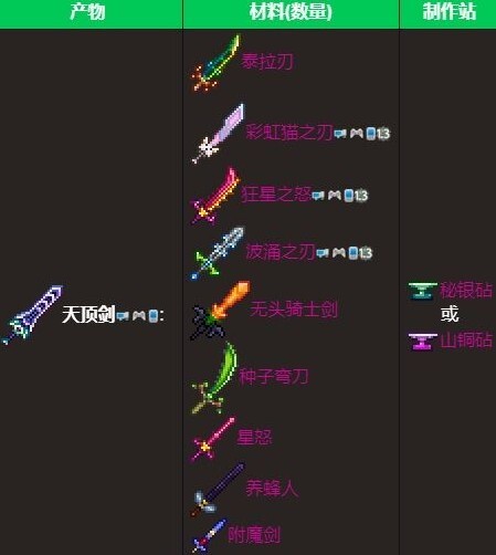 泰拉瑞亚天顶剑合成表及它的材料的莸取方法