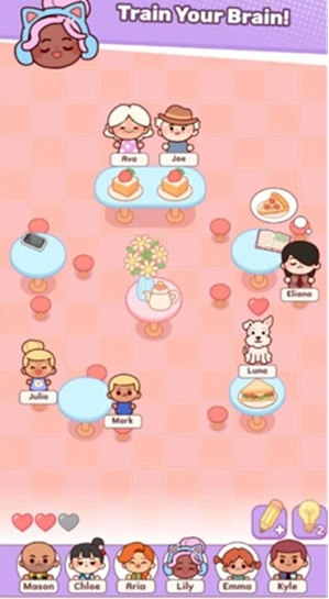 1、依据关卡下方给出的提示,在游戏中为不同角色安排座位,把各个角色放置到相应位置。