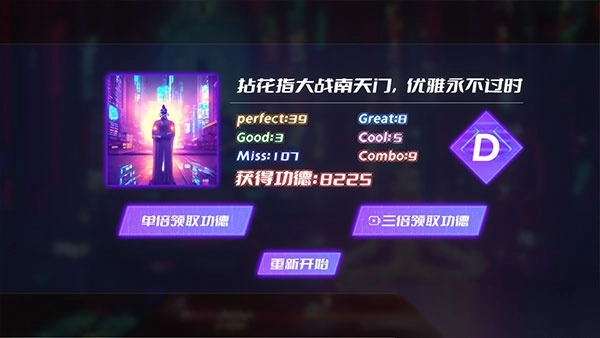 3、玩家完成音乐挑战后,可在结算界面得到功德值,功德值就是玩家获得的分数。