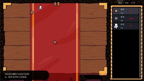 幸运硬币是一款从Steam移植而来的休闲益智类游戏。其玩法极为简单,只需翻转屏幕上的硬币,当硬币最终呈现反面朝上状态,就能获取一枚新硬币。通过积攒收益,可用于兑换新物品或增益BUFF,如此便能持续积累更多财富。不仅可以兑换更多铜币、金币、银币用于翻转,还能够雇佣小人,这样既能解放双手,又能加快收益速度。