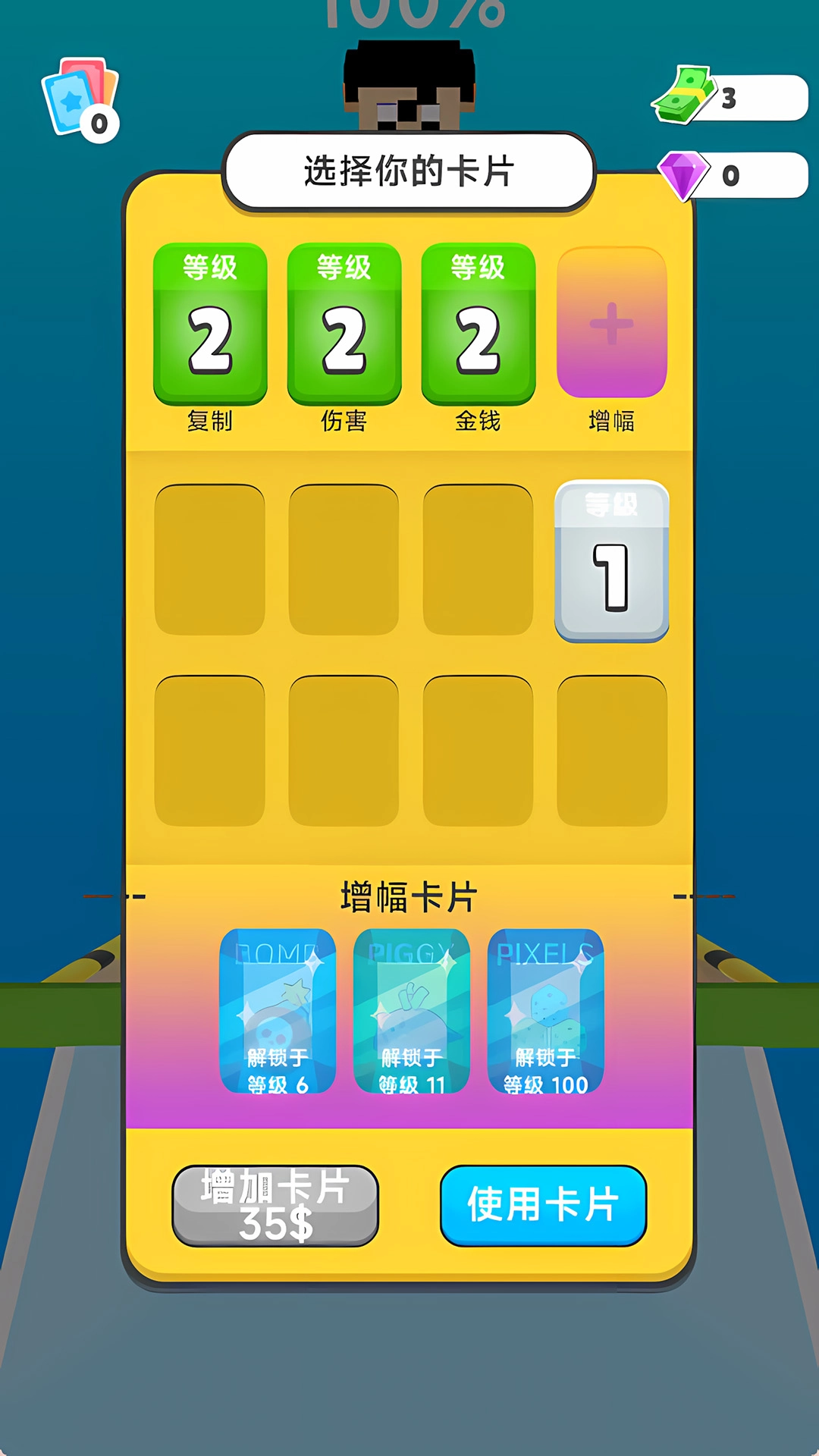 3、玩家可选择 复制伤害金钱,合理搭配卡片可提升表现,增加策略性。