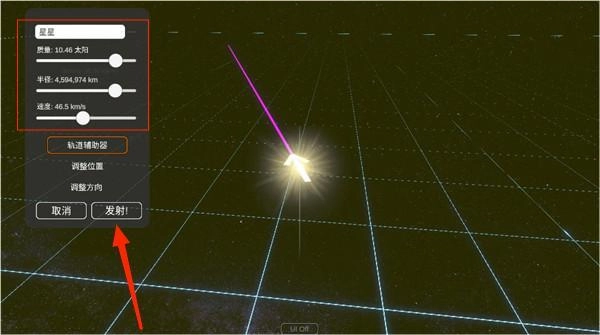 4、位置方向确定好后,然后可以调整球体的大小、自转速度以及质量等,参数设置完毕后点击发射即可