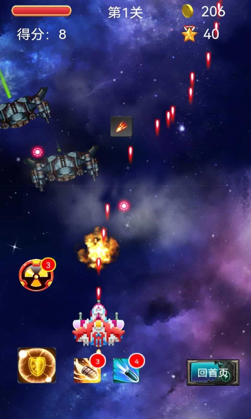 单指滑动即可精准控制战机走位,自动射击系统让玩家专注闪避与策略。 积攒能量释放毁灭性大招,合理搭配普通攻击与技能形成强力连段。 包含主线剧情、无尽模式、Boss速通等多样化玩法,满足不同玩家的挑战需求。游戏亮点
