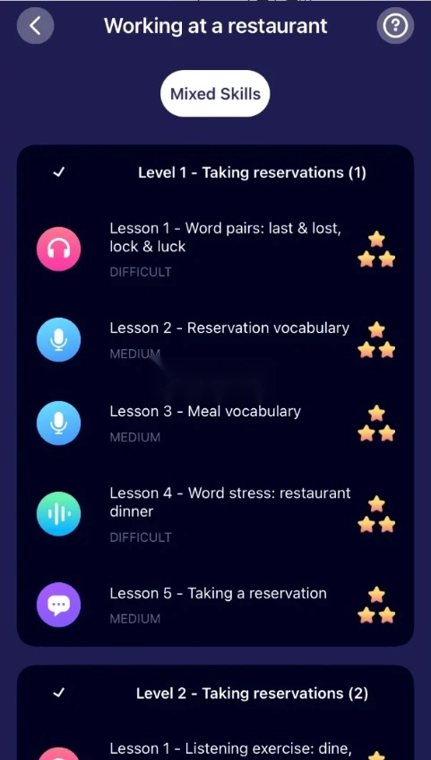 3、循序渐进的单元安排,以及各种类型训练模式(听力,单词发音,单词重音,句子发音,词之间的连音)和各种水平的训练(易,中,难)