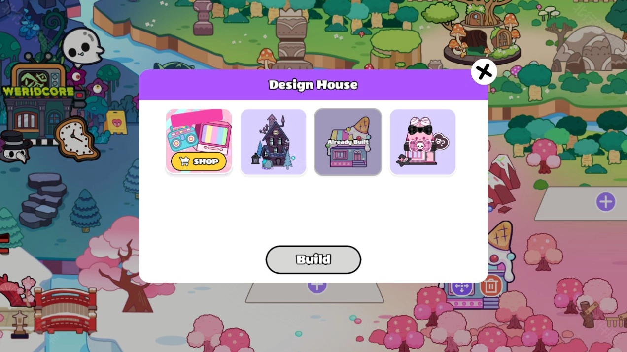 3、有3个免费房屋可以建造,更多房屋可以进入SHOP(商店)中购买。选择房屋后,点击下方的Build即可完成建造