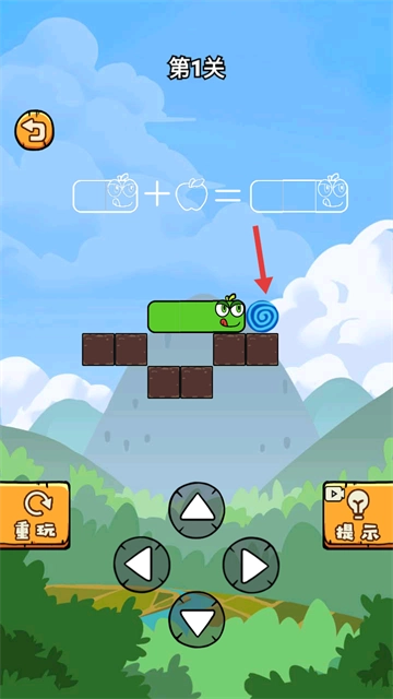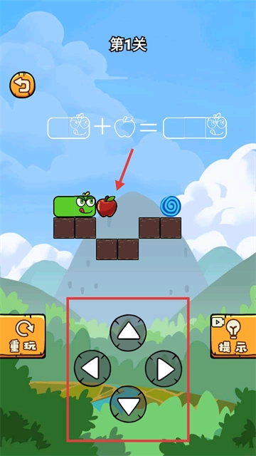 2、在第1关,操控绿色小蛇(通过下方方向键),先吃掉苹果。