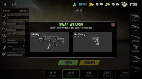 2、点击左侧的“WEAPONS”,选择想要使用的武器,右侧是枪的类型,左侧可以看到相关的数值。