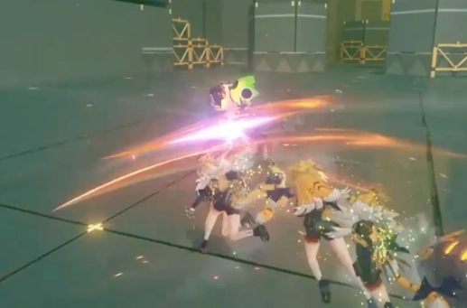 3、场景融合:工业风场地(钢架背景)与技能特效联动(斩击拖影、地面光痕),将环境化为战斗表现的延伸,强化“场景→战斗”的沉浸关联。