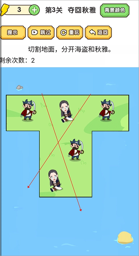 第三关:画一条呈“X”形状的线,把两边的秋雅都救出来,注意不能只救其中一人哦。