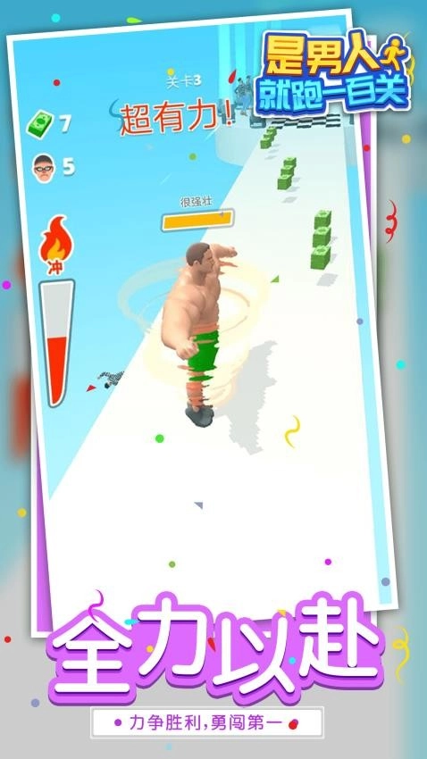 《是男人就跑一百关》是一款趣味性十足的休闲跑酷游戏。在游戏里,玩家要操控独具特色的肌肉猛男,开启热血刺激的跑酷冒险之旅。一路上,形形色色的围墙障碍层出不穷,等待玩家去突破。只要全力冲刺,冲破所有障碍与陷阱,成功抵达终点,就能获取基础的结算奖励。而且,独特的花式特技玩家可随意点击尝试。基本上每一关都设有特殊的花式任务,完成特技表演,就能额外收获资源道具,带来超畅爽的操作体验。面对各种障碍物,直接粉碎突破即可。只要确保角色状态良好、强度提升,就能突破一切阻碍,不会受到太多阻拦与限制,整体的趣味性和可玩性极高。