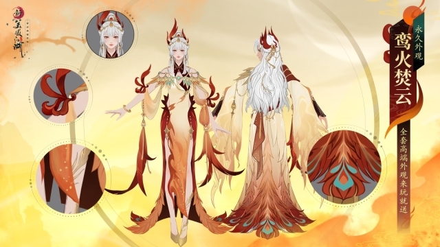 五周年庆典限定的高端外观“鸾火焚云”,涵盖了衣服、发型、背饰和坐骑一整套内容,只要参与周年活动就能免费获取!这套外观里的“劫火涅衣”,设计灵感来源于凤凰涅槃的震撼场面,把凤凰的高贵姿态和熊熊火焰精妙地结合在了一起。它的羽翼轻盈灵动,恰似烈焰凤凰掠过天际般气势凌厉,被精心绣制或印制在衣襟、袖口以及裙摆各处。让各位少侠仿佛化作浴火重生的凤凰,振翅飞翔在绚烂多彩的云海之中。