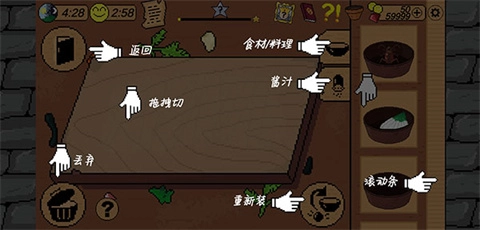 3、返回主页点击菜板,将右侧的食材拖动到左侧的案板上,滑动屏幕就可以进行切菜,还有不同的料汁可以选择进行腌制,完成点击图示右下角的“重新装”放入碗中,不需要的部分可以点击垃圾桶抛弃。