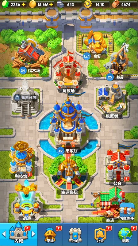 内城中首先是4大资源点:主城获取信赖、伐木场获取木头、金矿获取金币、铁矿获取铁块,建议升级顺序是主城→伐木场→铁矿→金矿。