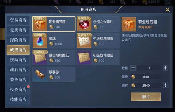 建议玩家兑换每周限购的材料,只要玩家坚持做这些威望活动,获得的威望币就足够全部兑换了。