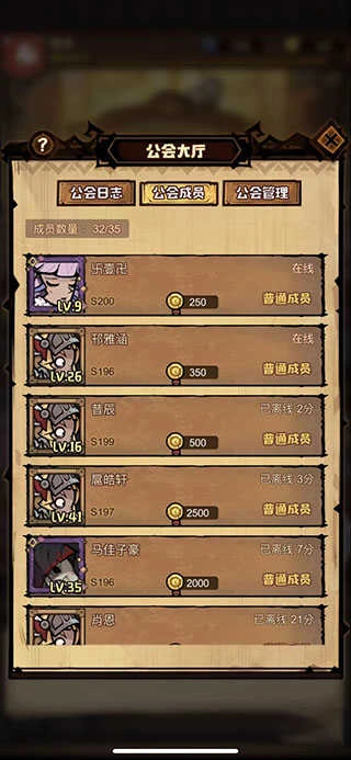 1、玩家进入到公会大厅时,就可以看到公会日志、公会成员和公会管理这三个界面,公会日志主要包括成员的增减数量、等级的提升等,公会成员界面能看到公会中所有成员的等级和活跃度,公会管理主要是公会的管理人员用来操作管理工会的界面,值得玩家们注意的是,退出现有的公会,加入到新的公会时,会有八个小时的实习期哦,这个时期,一部分的公会功能玩家是无法参与使用的。