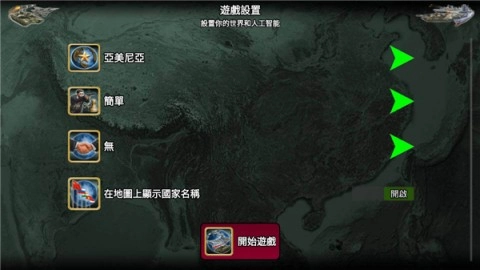 游戏中,可选择的国家和开始进行游戏的选项一应俱全。