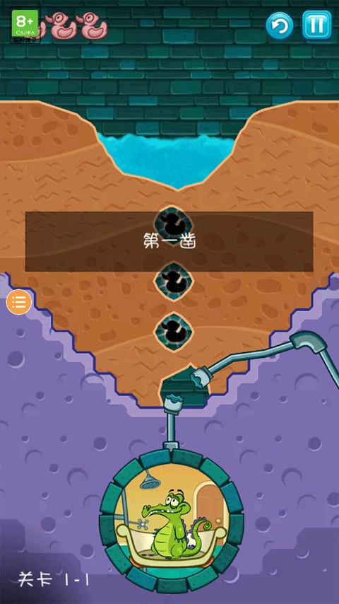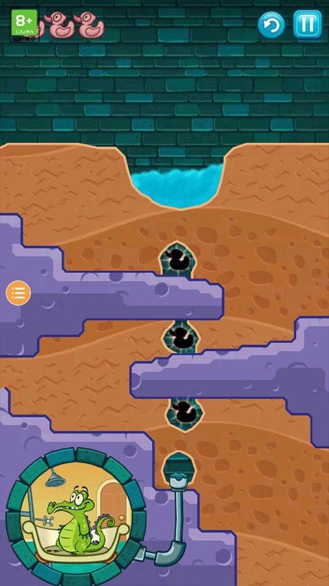 5、让水成功流到小鳄鱼位置,让小鳄鱼成功洗上一个舒服的澡即可通过关卡。