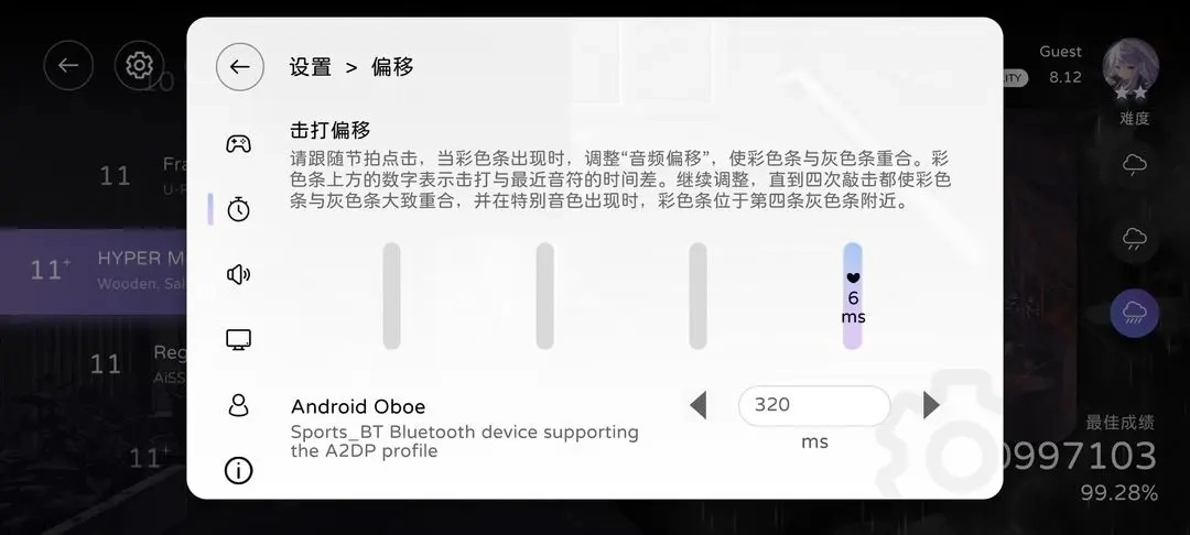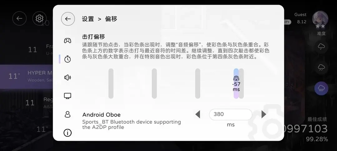 玩家需要跟随音乐节拍击打空白区域,此时根据彩色条的显示数值来调整延迟数值,以上图为例,彩色条为-57ms,目前偏移量为380ms,相加得到323ms,取320ms。再次测试出现爱心图标说明延迟对应正确。说明偏移调试成功了。