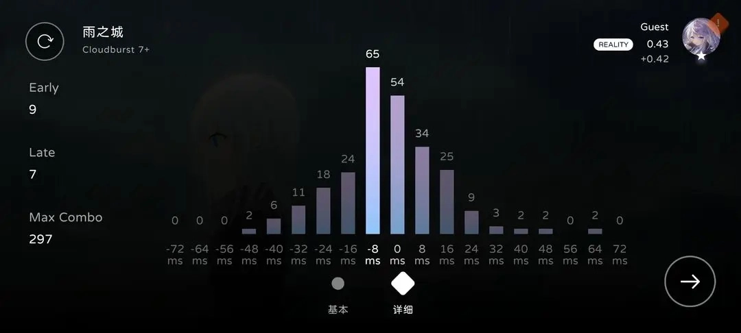 此外,由于每位玩家的设备性能,个人抓拍习惯,流速等原因,偏移并不一定就适合自己,因此需要根据游玩具体情况再次进行调整。选择一首自己可以轻易获得高分的谱面进行游玩,然后选择下面的详细,可以查看判定分布图。