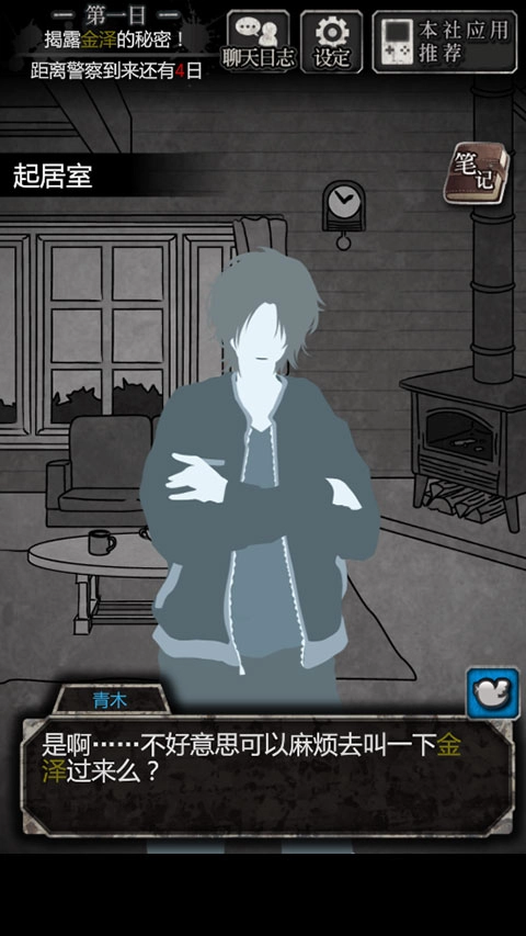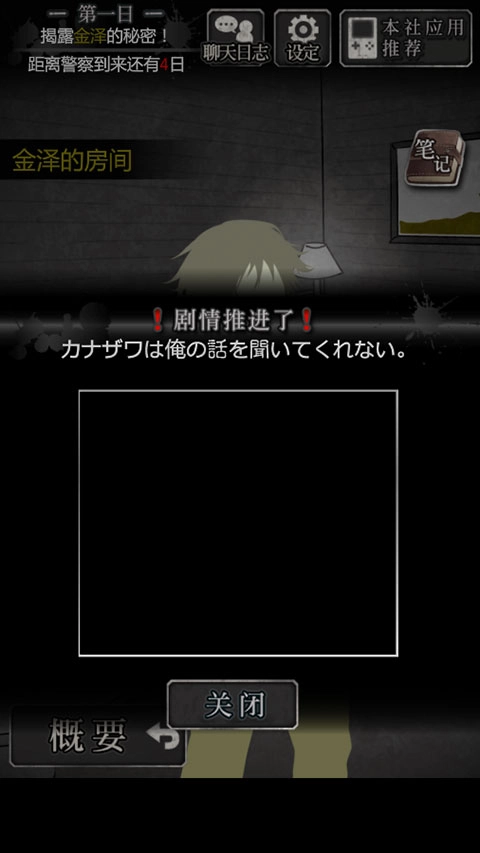 需要注意的是二周目剧情:在这次调查的最后阶段,在点击“结束里工作”之前,进入三楼金泽的房间,和金泽进行对话,得到物证“录音”(需要注意的是这个剧情只有二周目才会有,如果不获得证据将会进入一周目结局)
