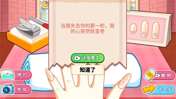 2、美甲服务前先与虚拟顾客确认需求细节,比如甲油胶颜色、图案偏好,按需求准备工具,减少后续修改次数,提升顾客满意度。