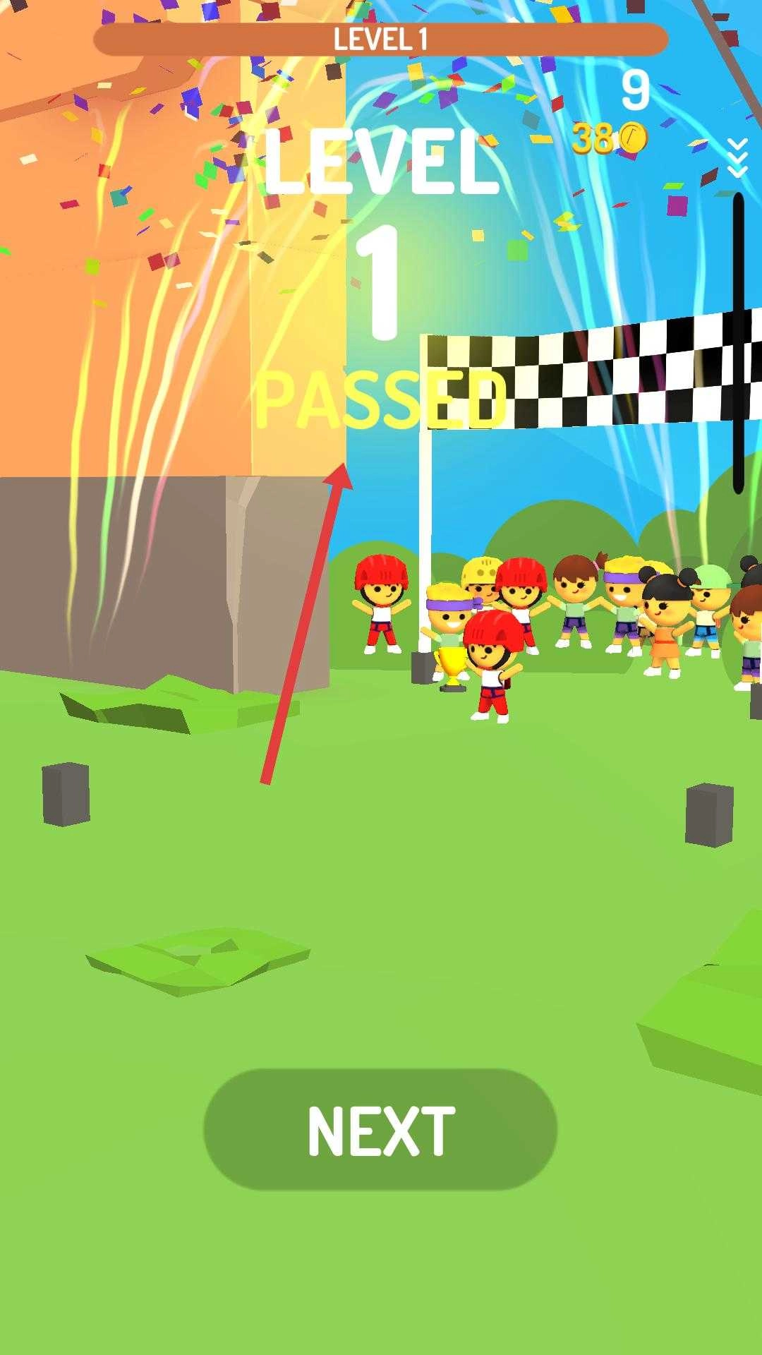 4、成功通过第一关后,界面显示第一关通过,点击下方绿色NEXT按钮,即可进入下一关继续挑战。