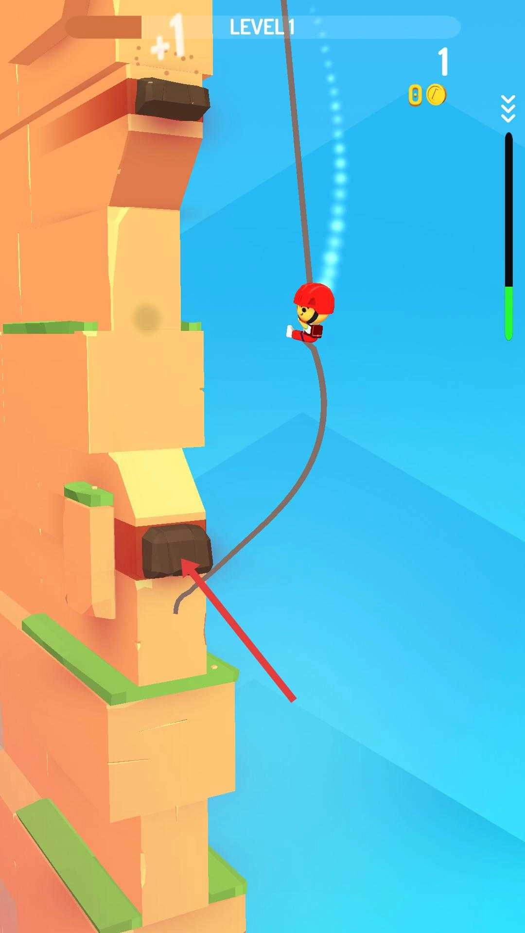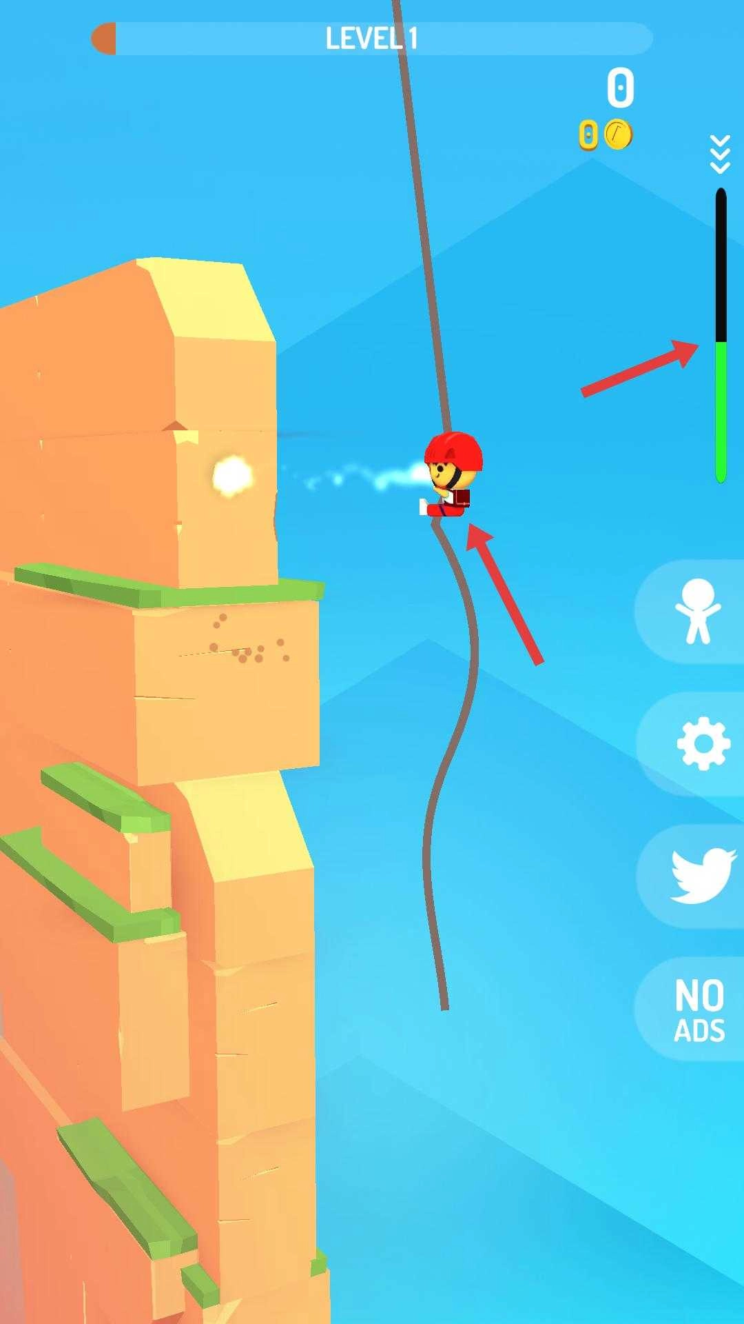 1、开启第一关,控制头戴红色头盔的角色顺着绳索往下滑,右侧的进度条会展示当前状态,需留意观察周边环境。