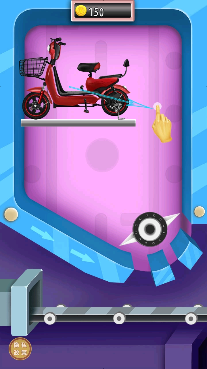 2、在游戏操作界面,按提示点击屏幕,对红色电动车进行拆解操作,获取金币(如初始的150金币)。