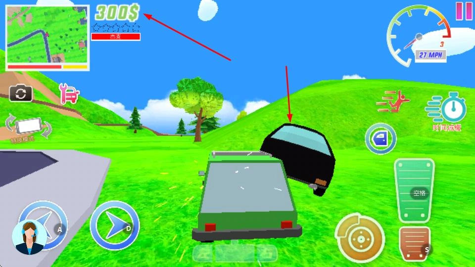 1、控制角色在草地、街道等场景中移动,通过左侧虚拟摇杆来调整方向,探索地图,开始时可以获得300美元等资源。