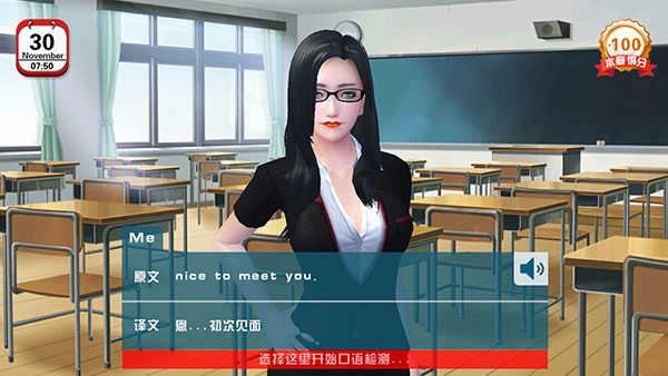 3、在关键剧情处,需要玩家点击下方红色长条按钮来进行录音,朗读出上方英文对话语句。