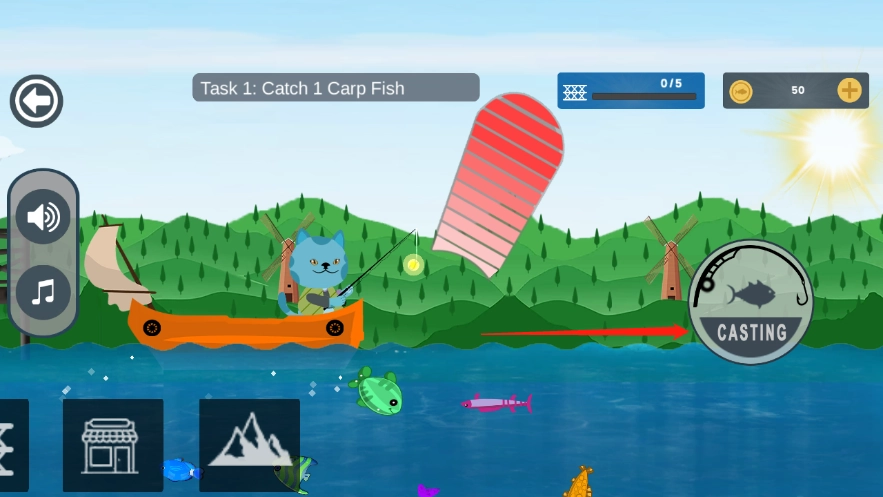 2、然后点击下方这个按钮,可以将鱼竿投入水中;长按的时间越久,线越长;