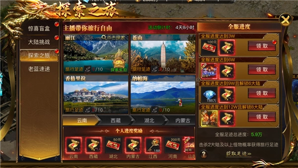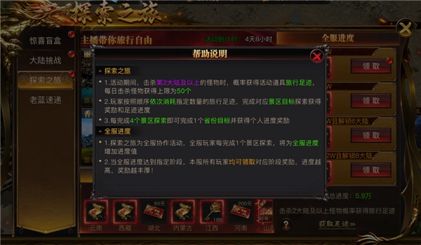 4.探索之旅为全服协作活动,全服玩家每完成1个景区探索,将为全服足迹总进度增加进度值;