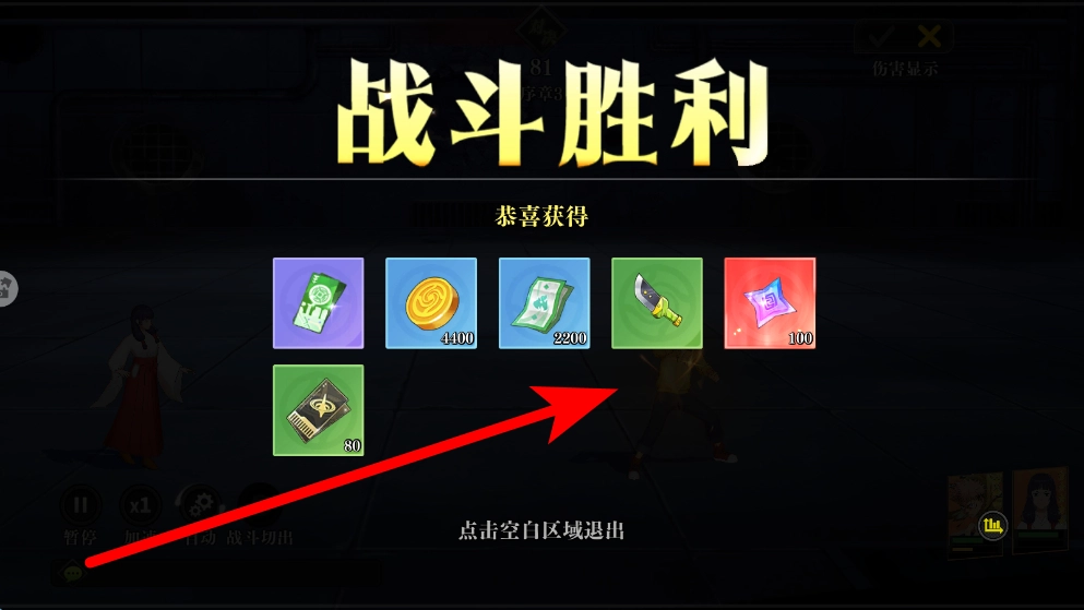 4、当成功战胜敌人后,屏幕上会弹出战斗胜利界面,与此同时,玩家能够获取包括不同数量货币、道具等在内的多种奖励。若想退出该界面,继续进行后续游戏内容,只需点击空白区域即可。