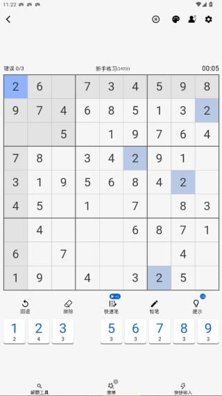 笔记模式:在空格内标记可能的候选数字,帮助推理。