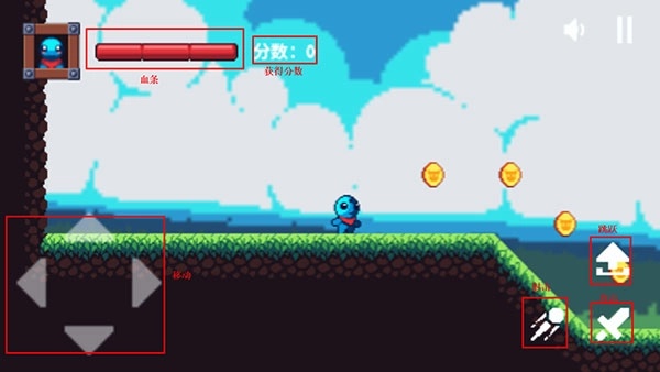 2、点击开始游戏,左边按钮为移动角色,右边可以跳跃、远程射击、近身攻击;