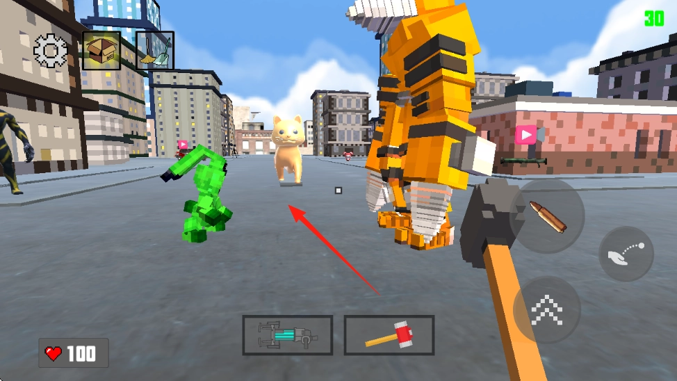 1、以第一视角操控角色,在城市街道的场景中,使用锤子武器攻击绿色生物、黄色机器人等敌人。