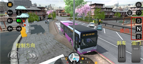 7、进入游戏后就可以操作,小编在图中为各位小伙伴进行了简单标注,其中D为前进挡,也称驱动挡;N为空挡,暂时停车时(如红灯),注意,此挡位表示空挡,为防止车辆在斜坡上溜动,一定要踩着刹车。R为倒车挡,倒车时用。