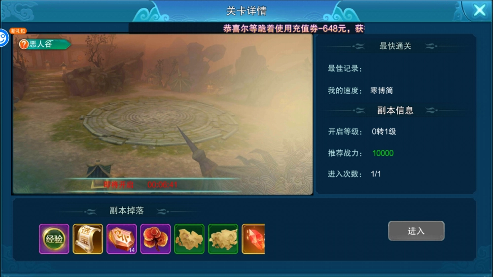 2、通关地牢天井,达到挑战条件即可挑战新的地牢关卡,首次成功通关当前层可获得额外的首通奖励,每5层为BOSS关卡,BOSS分攻击、防御、气血性三种属性,每天有一次扫荡所有已通关层机会,每天凌晨24点更新扫荡次数。