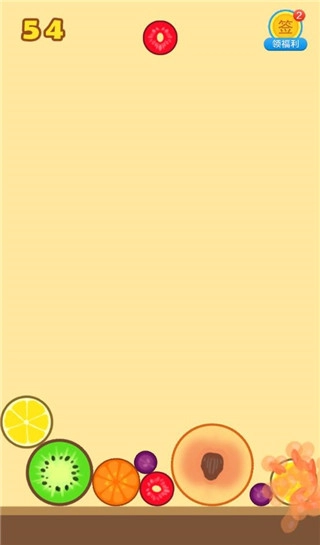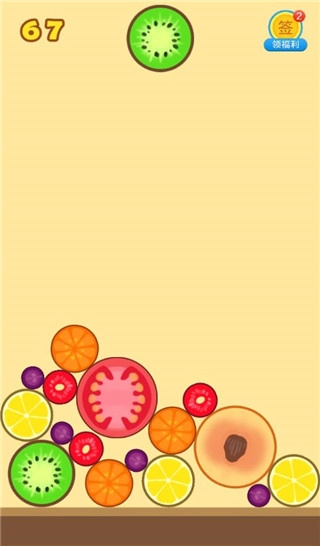 2、一开始玩建议大家有序的排列水果,遵从一个角落水果最大,越往外水果越小的感觉(类似2048),这样容易产生连续合成而节约空间。而且一旦大水果在中间很容易堆太高导致游戏失败。