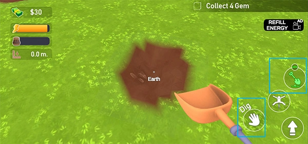 通过点击或滑动屏幕操控角色挖掘土壤、沙石与岩石层,持续向下掘进。
