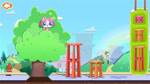 火灭了,但树上的小猫被吓得不敢下来,把右侧的凳子按「大→中→小」顺序叠成梯子,小猫就会顺着梯子安全跳下。